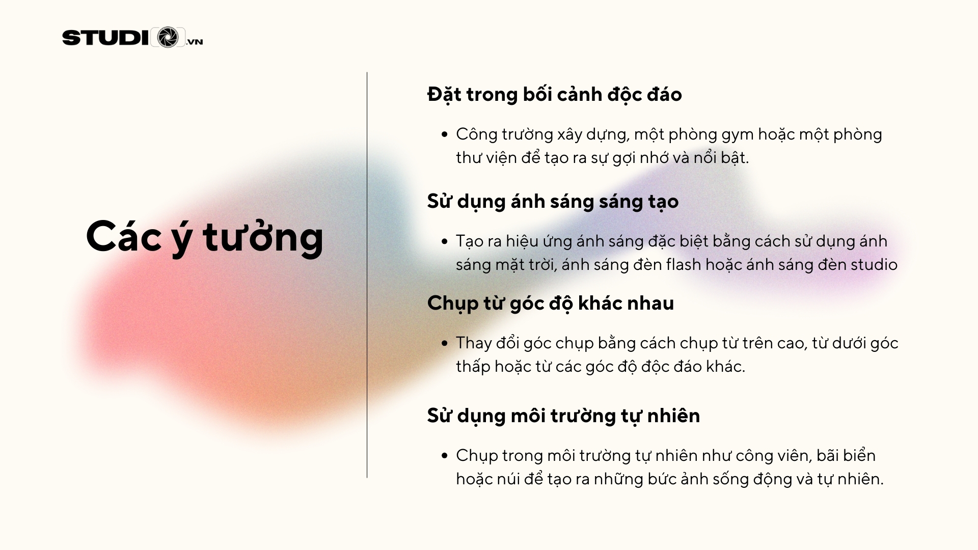 - Đặt trong bối cảnh độc đáo: Chụp người được chụp trong một bối cảnh độc đáo như một công trường xây dựng, một phòng gym hoặc một phòng thư viện để tạo ra sự gợi nhớ và nổi bật.