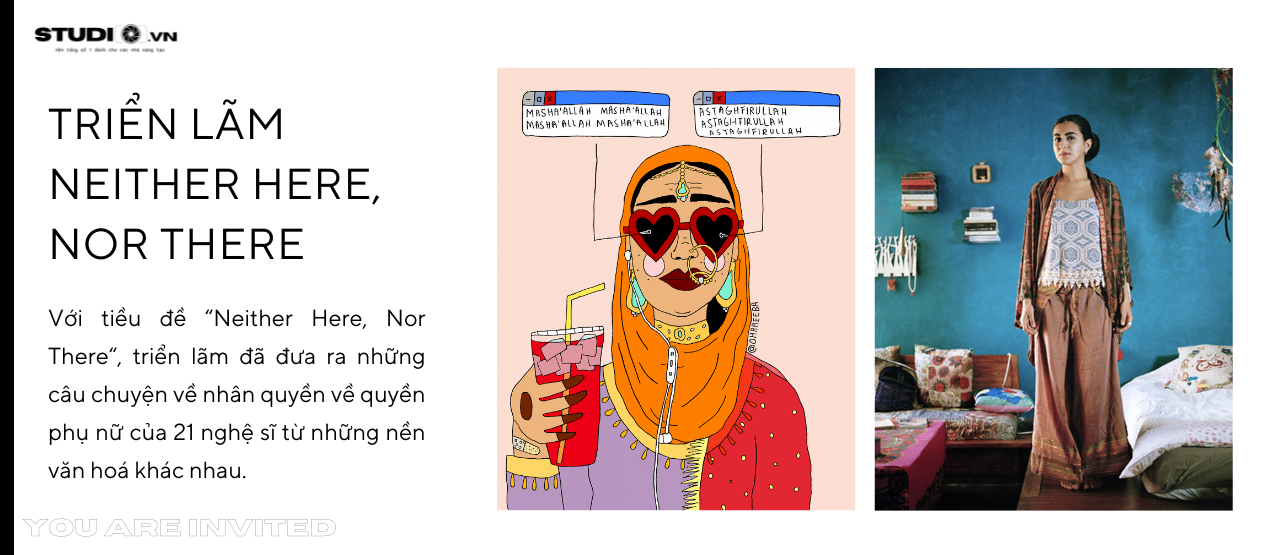 Với tiều đề “Neither Here, Nor There“, triển lãm đã đưa ra những câu chuyện về nhân quyền về quyền phụ nữ của 21 nghệ sĩ từ những nền văn hoá khác nhau.