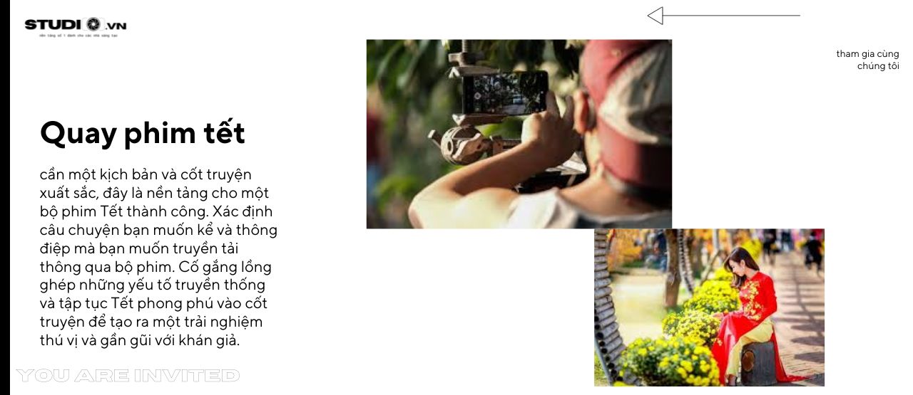Mỗi năm, cùng với sự chào đón năm mới, điện ảnh cũng tràn ngập không khí vui tươi và hồn nhiên của ngày Tết. Là dịp để gia đình sum vầy, để những câu chuyện đầy cảm xúc được kể lại và để những giây phút đáng nhớ được ghi lại trên màn bạc. Quay phim Tết không chỉ là một truyền thống, mà còn là một cách để lưu giữ những kỷ niệm đẹp, mang lại niềm vui và tạo nên những tác phẩm nghệ thuật độc đáo. Hãy đến với Studio.vn để tạo ra những bộ phim ngắn cho ngày tết vui tươi hơn.