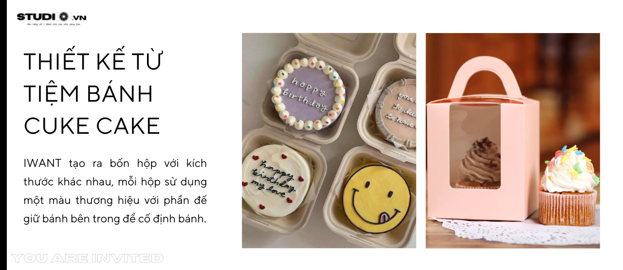 IWANT tạo ra bốn hộp với kích thước khác nhau, mỗi hộp sử dụng một màu thương hiệu với phần đế giữ bánh bên trong để cố định bánh. Túi được thiết kế để giữ hộp an toàn và đảm bảo rằng chiếc bánh được giao đến nguyên vẹn trong trạng thái đẹp nhất.