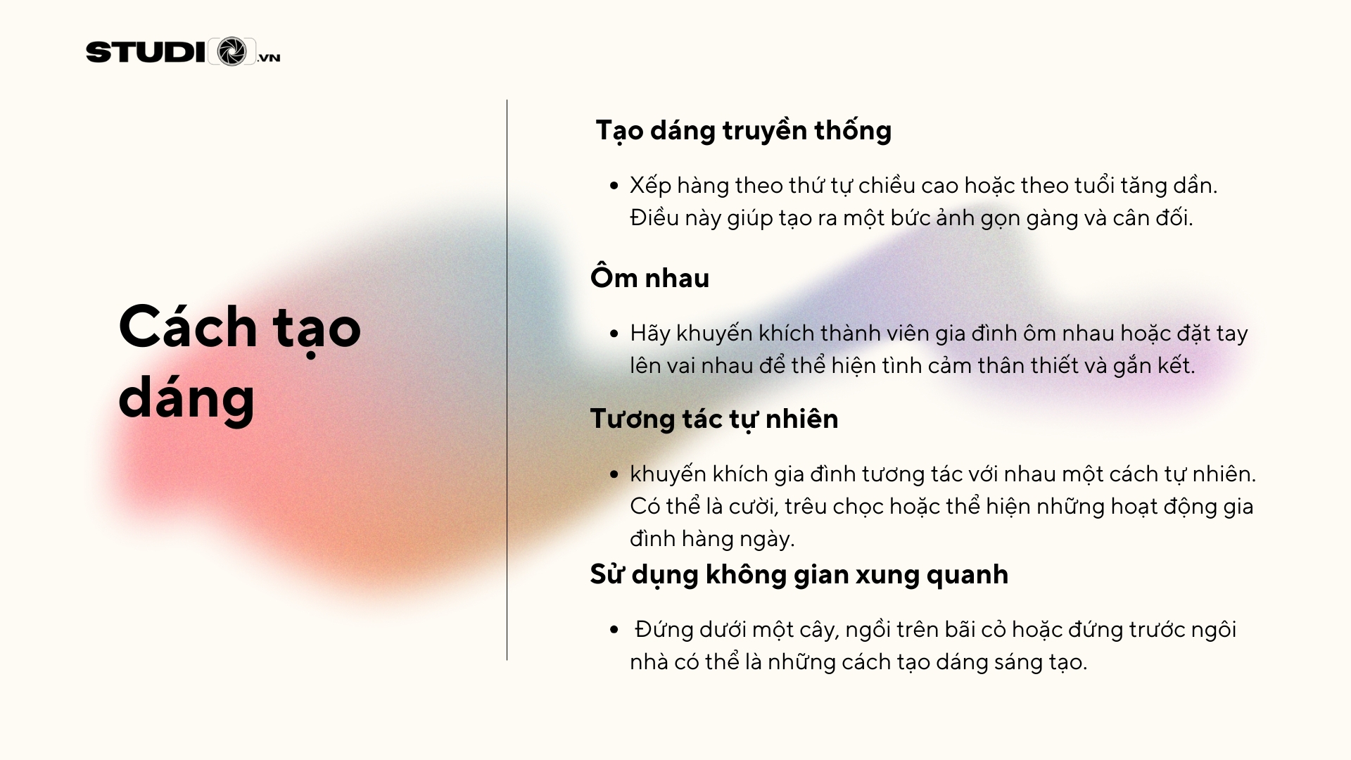 – Tạo dáng tương tác: Khuyến khích các thành viên gia đình tương tác với nhau bằng cách nắm tay, đặt tay lên vai hoặc trao đổi ánh mắt. Điều này thể hiện tình cảm và gắn kết giữa các thành viên.