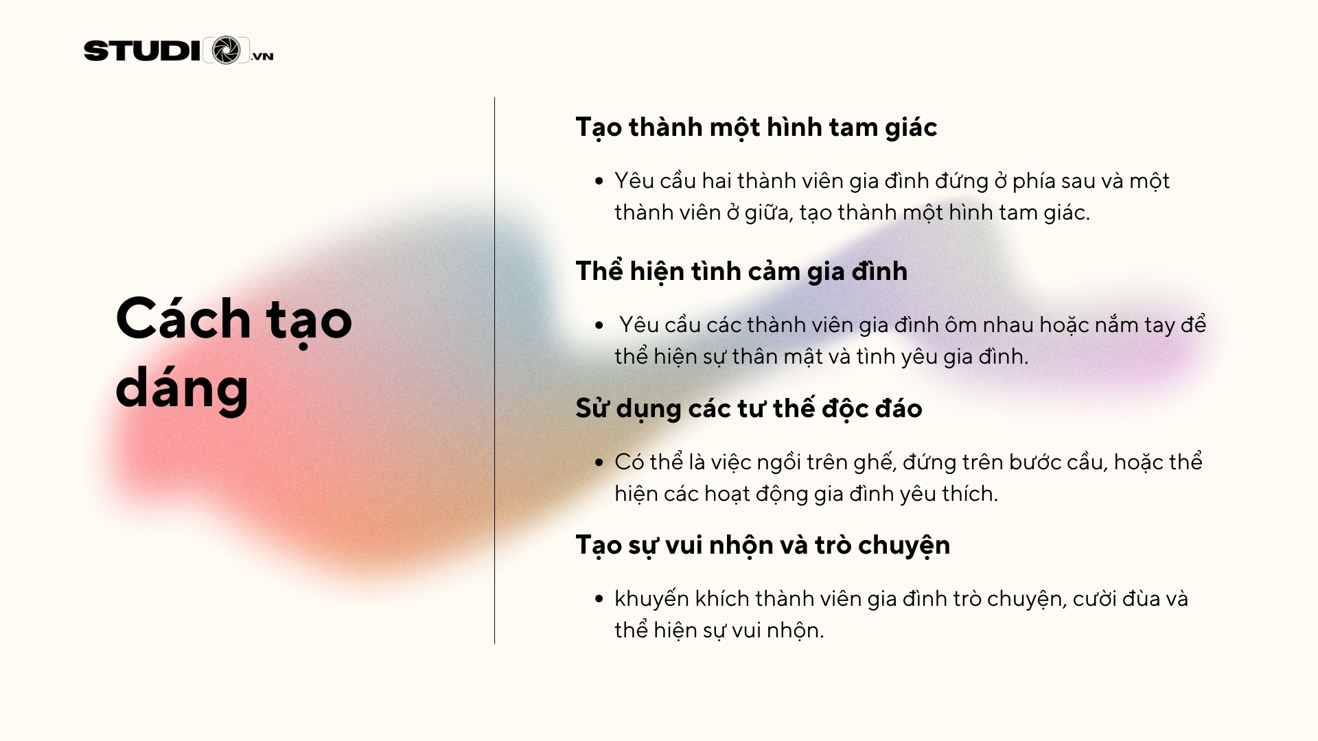 – Tạo sự gần gũi: Yêu cầu các thành viên gia đình đứng gần nhau, đặt tay lên vai hoặc ôm nhau để tạo cảm giác gần gũi và thân mật trong bức ảnh.